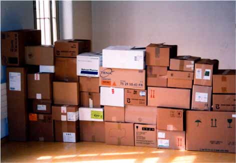 Im Rahmen des Projektes bot ich Patienten u.a. Verpackungskartons (Abfallprodukte aus dem Klinikalltag) als Material an. Die Unterschiede in Größe, Proportion, Typografie und Farbigkeit üben einen sinnlichen Reiz aus und fordern zum spielerischen Umgang heraus.